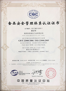南充佳美于2014年按ISO 22000標(biāo)準(zhǔn)建立食品安全管理體系,同時取得ISO 22000食品安全管理體系認(rèn)證證書。